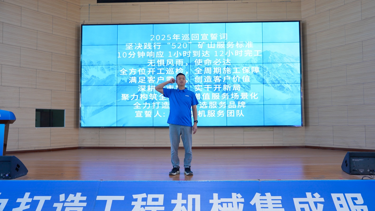 錚錚誓言聲聲入耳、字字入心。張總帶領(lǐng)服務(wù)團(tuán)隊(duì)莊嚴(yán)宣誓:“堅(jiān)決踐行“520”礦山服務(wù)標(biāo)準(zhǔn),10分鐘響應(yīng),1小時(shí)到達(dá),12小時(shí)完工;無(wú)懼風(fēng)雨,使命必達(dá),全方位開(kāi)工巡檢,全周期施工保障,滿足客戶需求,創(chuàng)造客戶價(jià)值;深耕后市場(chǎng),實(shí)干開(kāi)新局,聚力構(gòu)筑全心+,增值服務(wù)場(chǎng)景化,全力打造行業(yè)首選服務(wù)品牌”這一刻,堅(jiān)定的眼神交匯成信念的星河,嘹亮的聲音匯聚成前進(jìn)的號(hào)角。誓言既出,使命必達(dá)!智邦服務(wù)精英將駕乘服務(wù)車輛,在市井深處,在郊區(qū)鄉(xiāng)野,在每一個(gè)徐工挖機(jī)能到達(dá)的地方……向著初升的朝陽(yáng)方向延伸,讓服務(wù)的光芒照耀更遠(yuǎn)的地方。