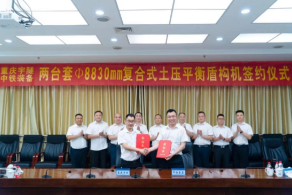 6月23日,中鐵裝備集團與重慶智邦集團——重慶宇隧交通設備有限公司在鄭州舉行兩臺φ8.83米復合式土壓平衡盾構機采購簽約儀式。